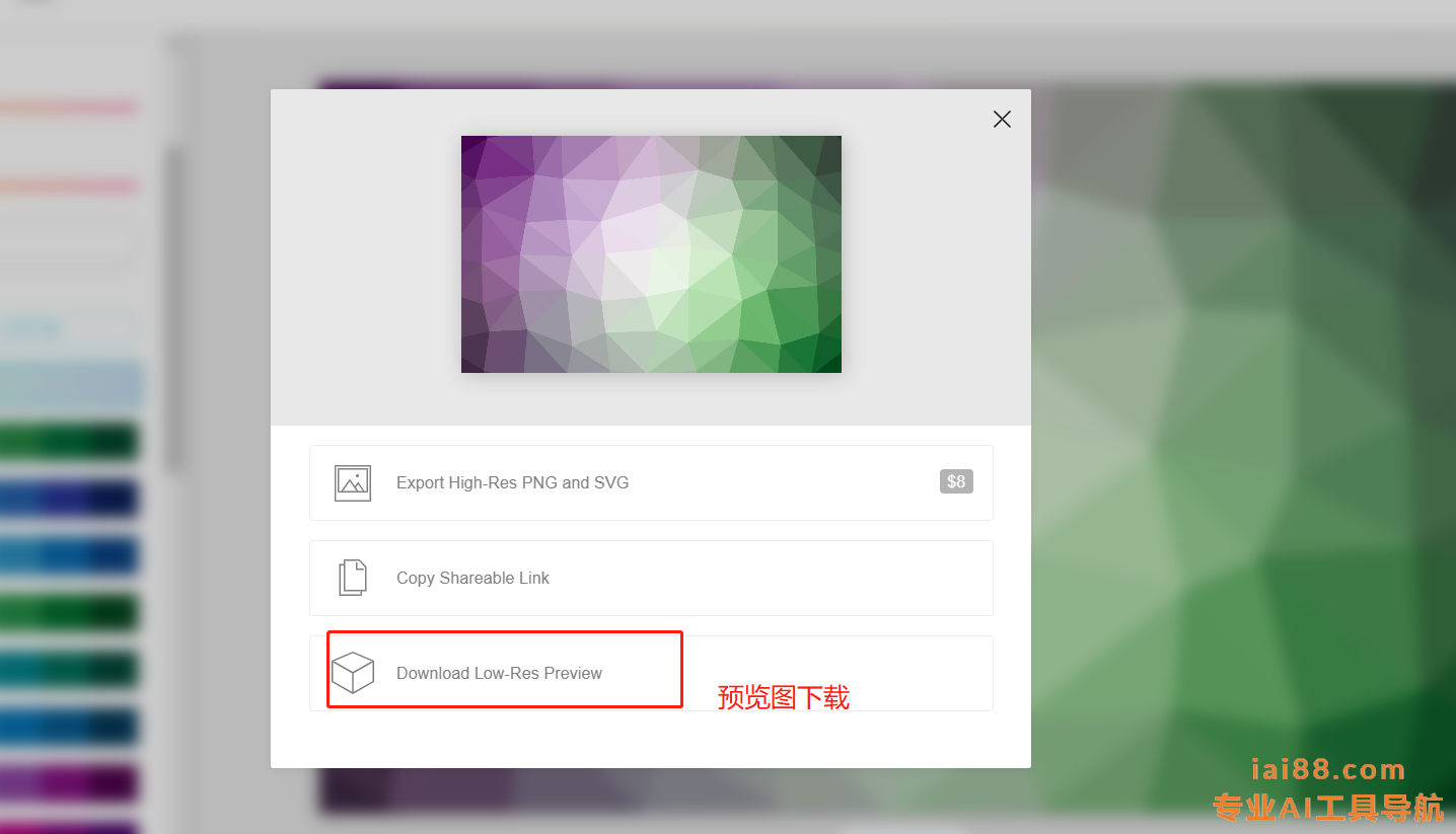 Trianglify提供多边形背景图片的在线制作与生成,用户可以自定义颜色、图片大小与图案强度,支持免费预览图片生成效果,导出高清PNG与SVG格式时需付费下载。