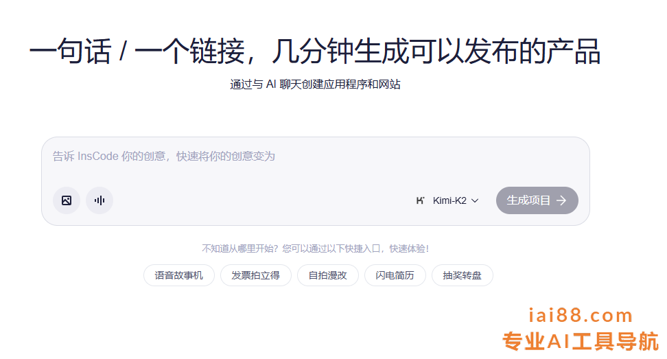 • AI生成项目:用户只需描述需求,AI就能生成如营销工具、发票识别、简历优化等项目。
