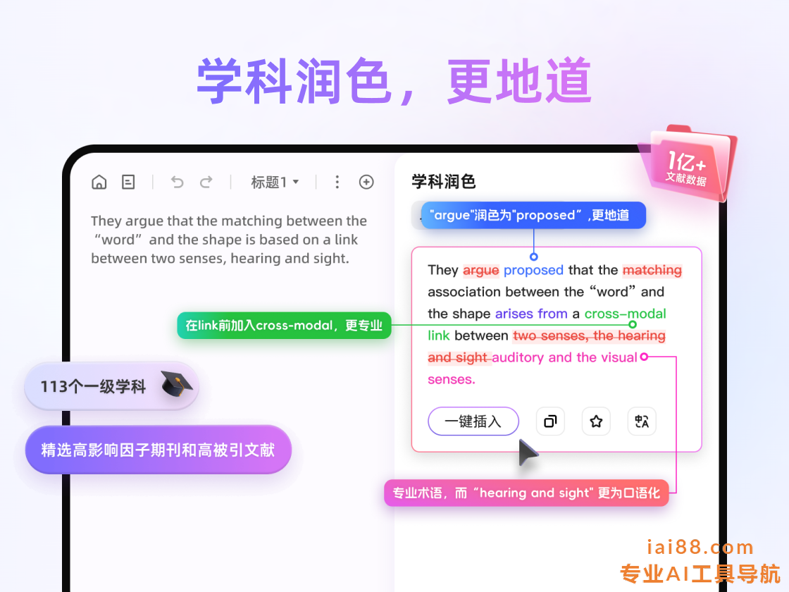 • 覆盖117个一级学科,超1.8亿篇文献,融入28万+的专业术语持续训练,围绕【翻译,润色,高分例句,模块句式,引文插入,期刊排版】等英文论文写作场景设计了专业的解决方案;