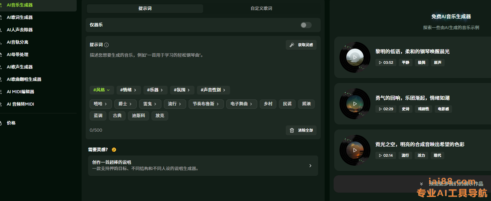 MusicAI 使用MusicAI创建原创歌曲 — 最佳AI音乐生成器和AI音乐视频生成器,可在几秒钟内将想法和歌词转化为免版税音乐。支持AI封面、人声消除、文本转歌、AI作曲和音频增强等多种功能。你可以根据自己的喜好创作独一无二的歌曲。