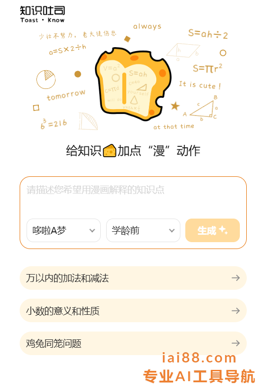 “知识吐司”是面向学龄前及基础教育阶段用户的 “趣味化知识传递工具”,通过 “知识 动漫 IP 互动形式” 的结合,降低低龄用户的学习门槛,让知识获取更具趣味性和互动性,核心思路是打破传统枯燥的知识灌输模式,借助 “吐司” 这一生活化、易感知的载体,结合动漫化(“漫” 动作)的呈现形式,让知识传递更贴近低龄用户的认知习惯。可以帮助用户把课本知识转化为 “逻辑连环、画风精美、故事性强” 的连环漫画。