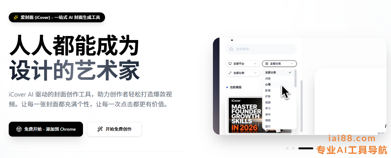 爱封面 (iCover) 是一款由 AI 驱动的一站式智能封面生成工具 ,旨在帮助视频创作者、博主和电商卖家轻松打造高点击率的”爆款”视频封面.专业的AI封面生成工具,功能强大又实用。 它支持免费生成小红书封面、公众号封面、小说封面、红包封面、视频封面等多种类型,能满足你多样化的需求。
