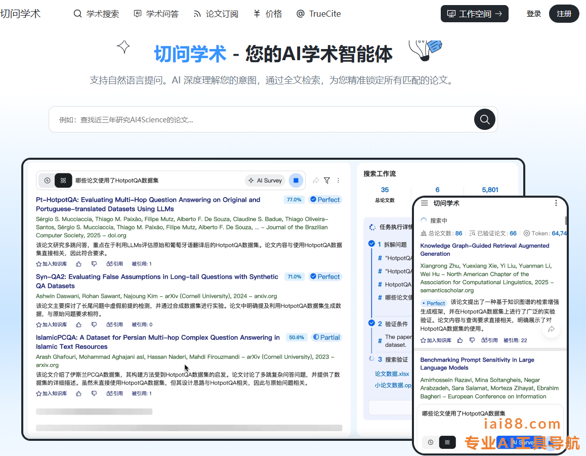 切问学术(切问研知) 是一款基于“意图验证”打造的AI学术智能体,核心区别于知网、维普、百度学术等传统关键词匹配式论文检索工具,以自然语言交互为核心,依托先进的NLP技术深度理解科研人员的检索意图,通过海量真实论文元数据的全文检索与精准验证,为科研工作者、学生、高校教师等群体筛选高价值核心文献,同时提供私人科研知识库构建、前沿学术成果智能追踪等全流程科研辅助能力,是集文献检索、知识管理、前沿追踪于一体的智能科研助手。