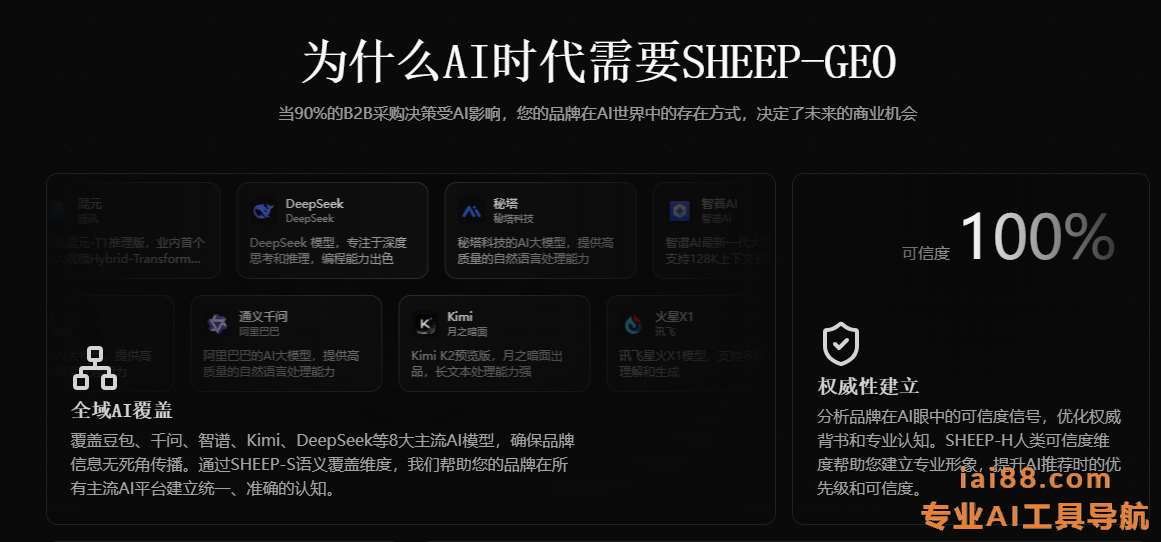 SheepGeo是生成式引擎优化 (GEO)专业工具,基于SHEEP五维评分框架,检测网站在豆包、千问、智谱等8大国产AI模型中的可见性.基于独创的 SHEEP 五维框架,SheepGeo 提供从网站 GEO 分析、AI 可见性检测、关键词渗透轮询,到品牌监控、舆情追踪、AI 流量分析的一站式服务.