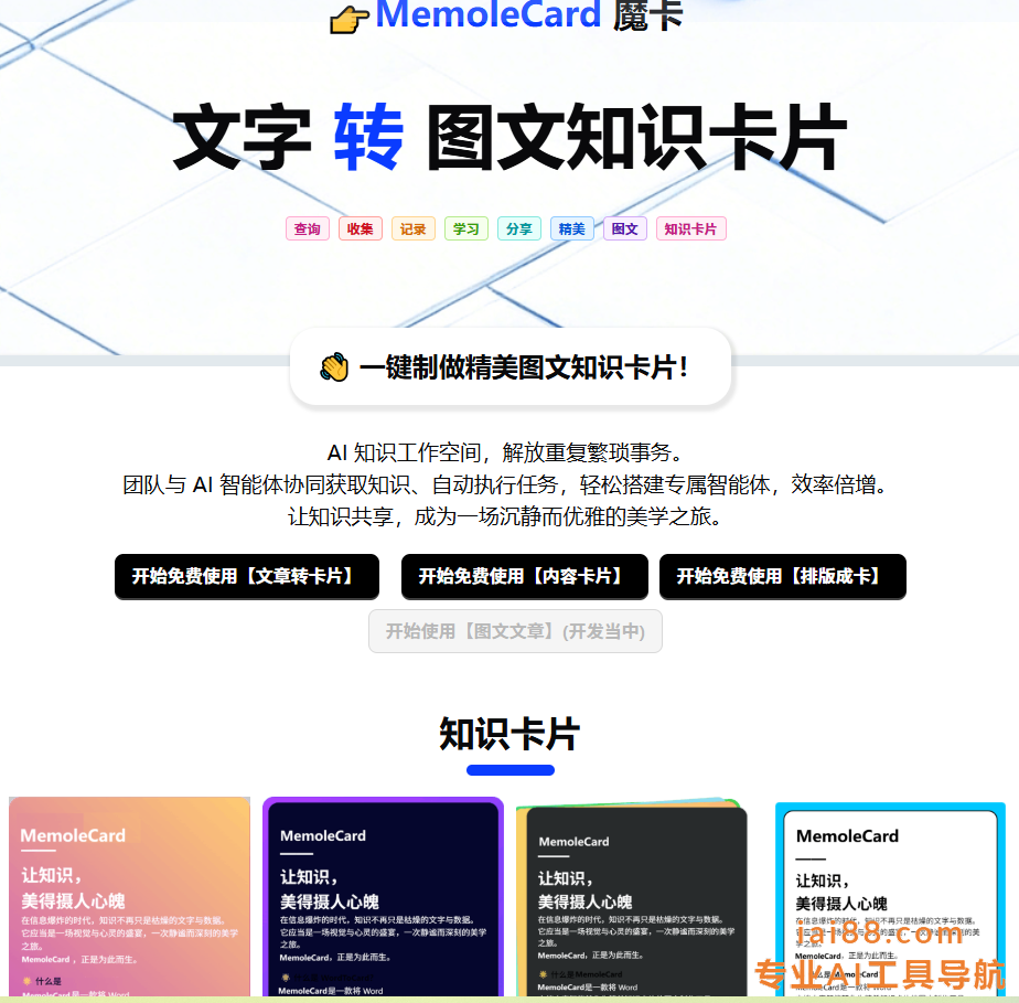 MemoleCard魔卡是一款AI驱动的知识管理工具,通过”文字转图文知识卡片”功能,简化知识整理与分享流程。