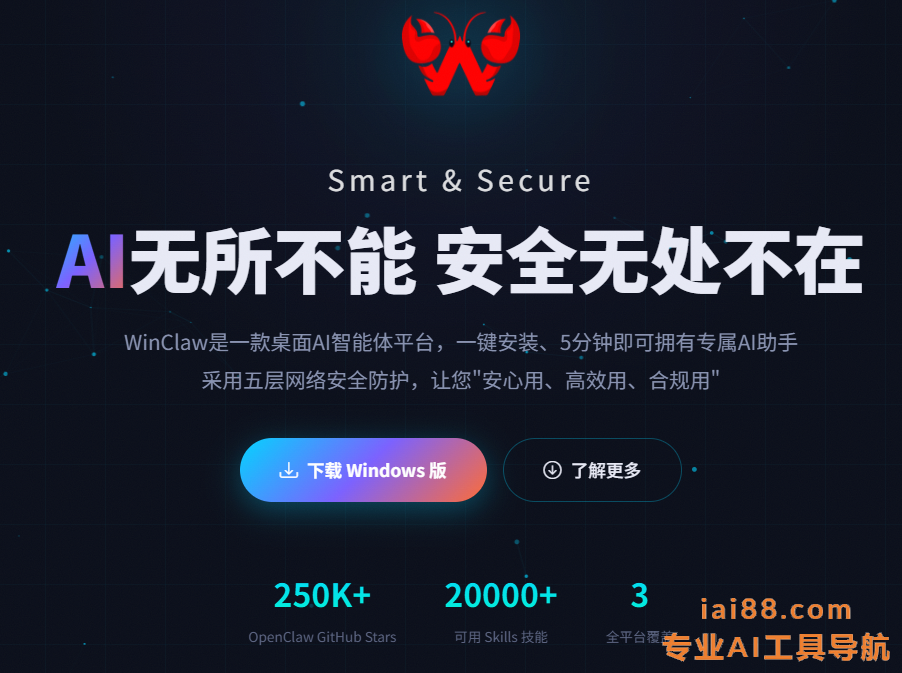 WinClaw 是威努特推出的桌面 AI 智能体平台,基于 OpenClaw 打造,主打”安全+易用”。WinClaw 采用五层安全防护体系(身份认证、安装审查、消息拦截、执行约束、监控审计),从源头阻断恶意 Skill 和数据泄露风险。WinClaw 支持一键安装、图形化配置,5 分钟可上手,兼容 Windows/macOS/Linux。工具内置丰富 Skills 生态,可对接微信、飞书、钉钉等主流平台,让个人和企业都能安全、高效地拥抱 AI 自动化。