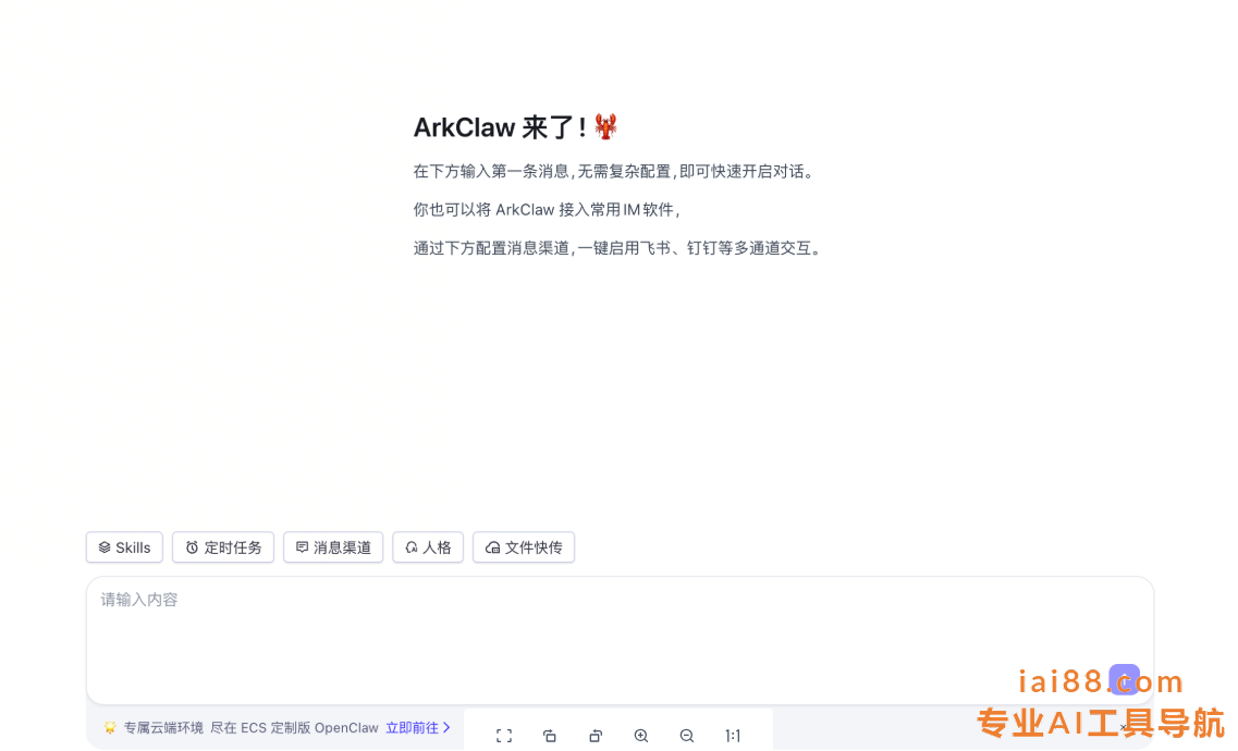 ArkClaw 是火山引擎提供的云端 AI 智能体(Agent)服务,能帮助您一键云端部署 OpenClaw,享有一对一专属 ECS 资源,免去复杂配置、7 × 24 在线。用户无需本地部署、无需编写代码,打开网页即可直接使用。