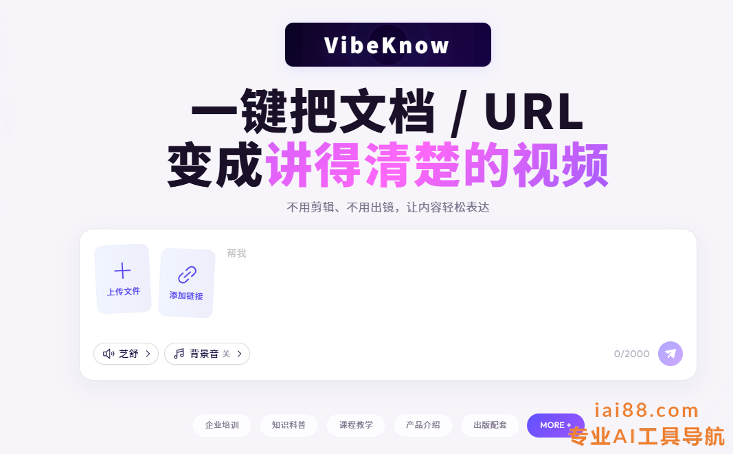 VibeKnow是一款面向知识内容生产的AI视频工具,强调将主题、文案或资料快速转化为结构化知识视频。平台可辅助完成选题拆解、脚本生成、镜头与素材匹配、配音合成及模板化剪辑,并支持高效发布 。