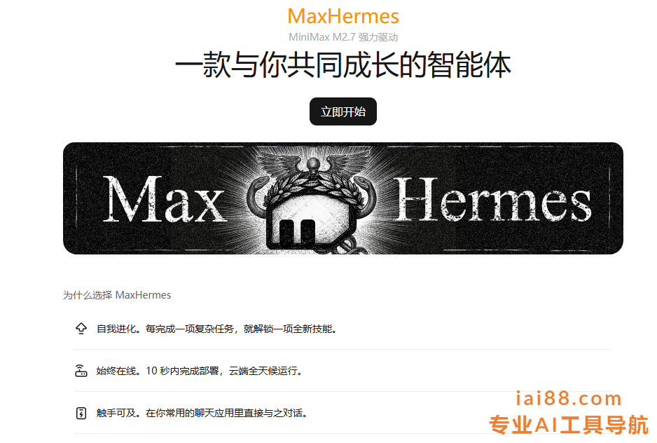 MaxHermes是MiniMax(海螺AI母公司)推出的全球首个云端沙箱自我进化AI助手,于2026年4月16日发布上线。MaxHermes基于Hermes Agent框架,与MiniMax自研M2.7大模型深度结合,核心能力在于自主提炼Skills技能并持续进化。每完成一项复杂任务,系统自动从中提炼出可复用的Skills技能,后续使用中按需加载,并能根据用户反馈持续自我改进。MaxHermes支持跨会话记忆、自动定时任务和多代理并行,无需本地部署,10秒即可在云端开通启用,目前已打通飞书、钉钉、企业微信等办公平台。