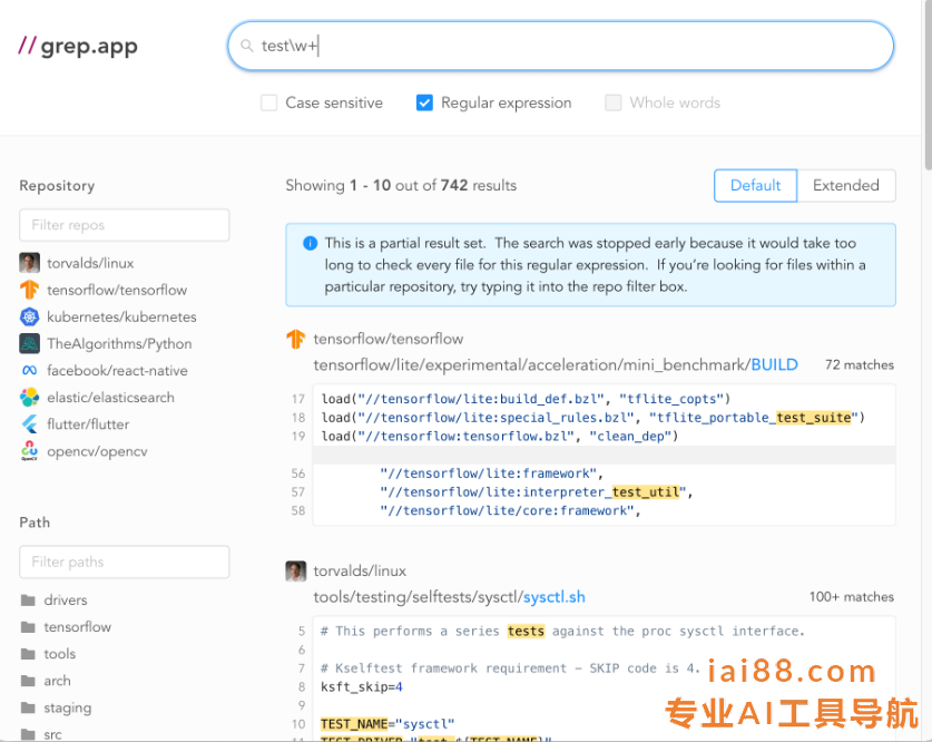 grep app,它是一个在线代码搜索引擎,它对程序员同学真的是太友好的,它能够搜索数十万个 git repos 存储库,而且呢按照正则表达式搜索、匹配整个单词、区分大小写,支持各种编程语言筛选。是一个不可多得的效率工具.