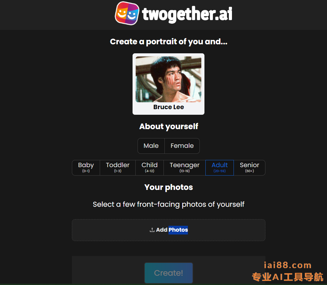 twogether.ai可以在线让它生成任意两人的高清合影实现AI合照生成。利用AI合影技术实现您与明星合影的愿望。