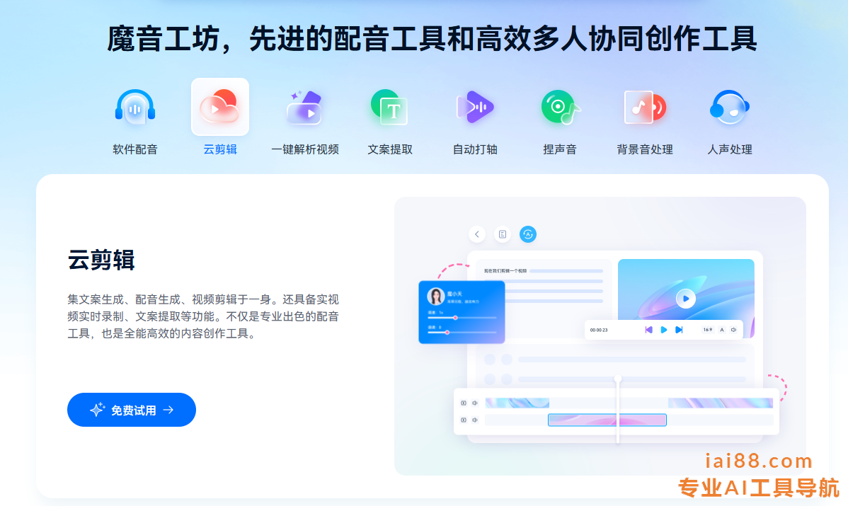 「魔音工坊」一款媲美真人的AI配音软件,为您轻松配出好声音。广泛应用于视频配音、新闻播报、有声书、有声电台、外语出海等多种配音场景,拥有800多款声音、1000多种风格.